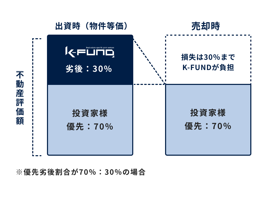 お客様を「優先出資者」、当社を「劣後出資者」と位置づけて、物件の運用期間中や売却時に損失が発生した場合は、劣後出資額(当社出資額)を限度に損失を吸収することで、優先出資者の元本の安全性を高めます。