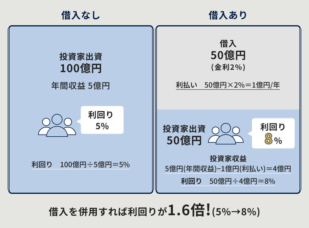 金融機関からの借入を併用することで、投資家からの出資額を抑え、出資額当たりのリターンを増大させることができます。